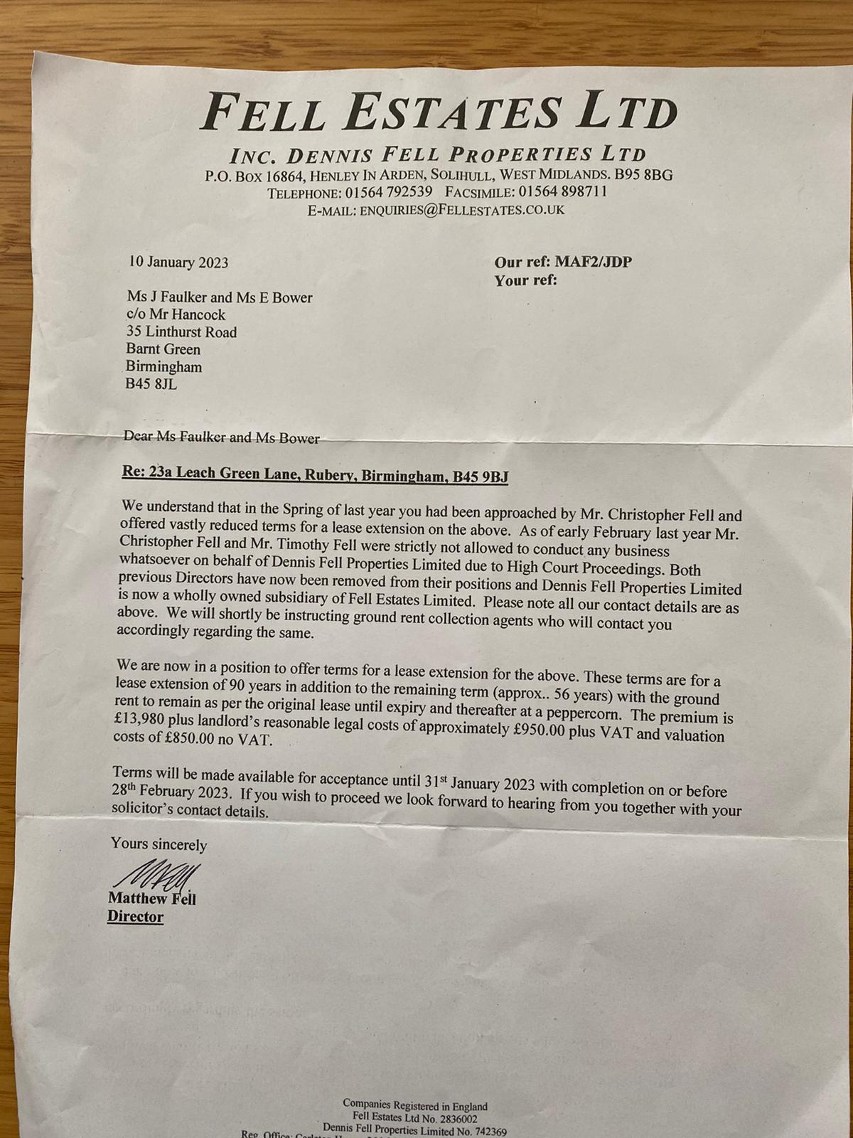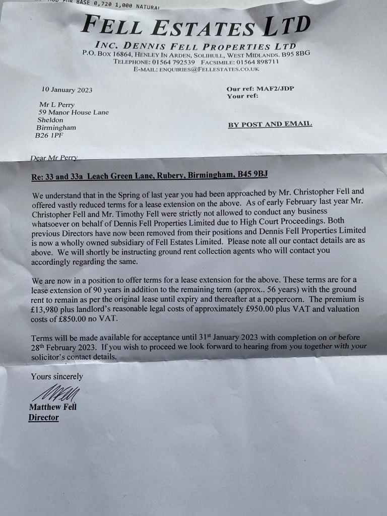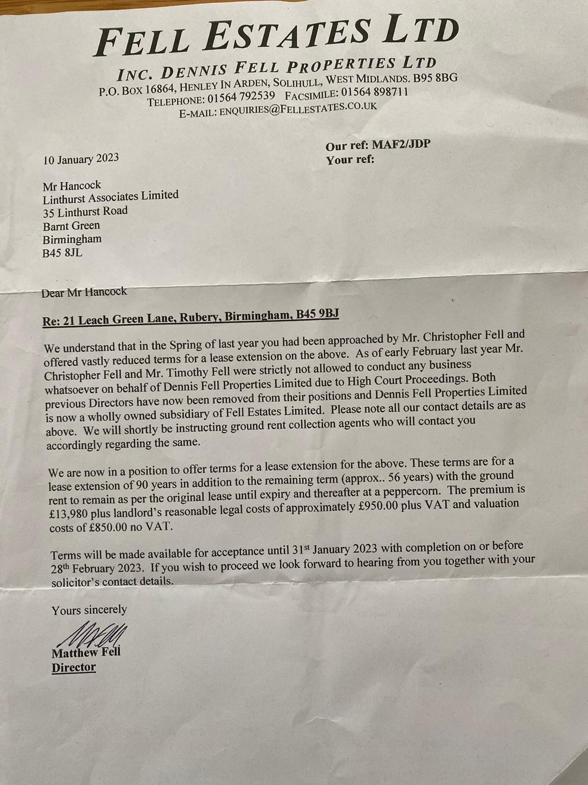 The first paragraph of this letter is wrong. No letter was sent on Dennis Fell Companies but Speedwell Estates Ltd.. As TDSF said, there can be no complaint. We negotiated at Double Mathew Fell's valuation of £4,000. (More if you take the nonsense of the extra 25% applied by an Invalid Valuer.