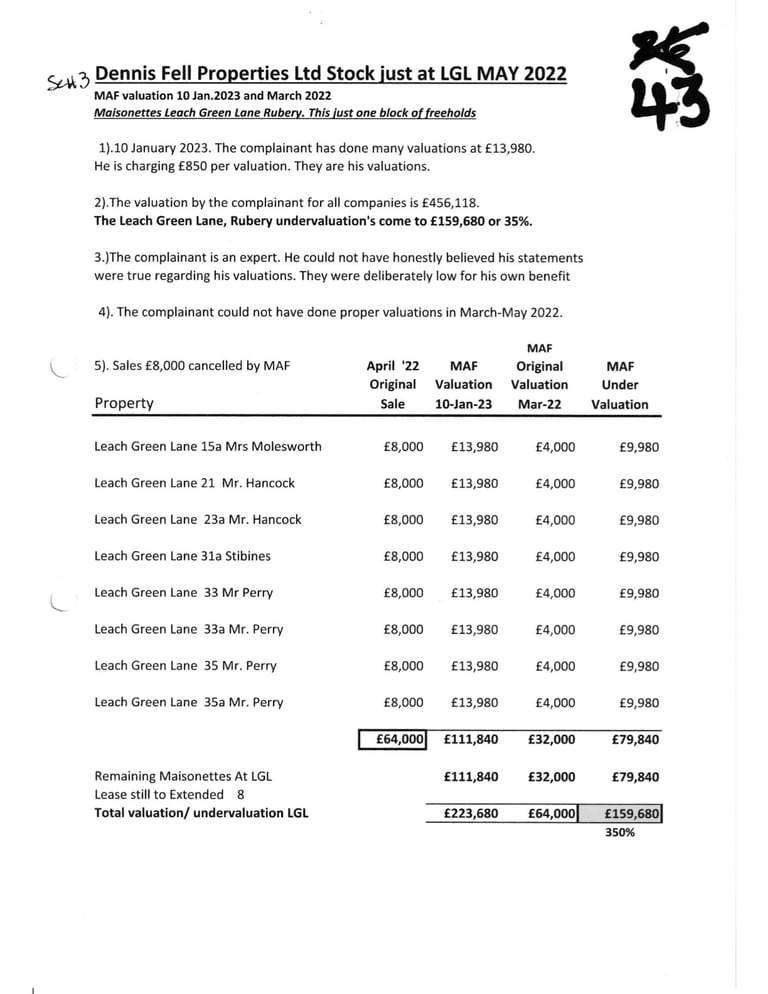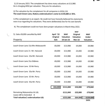 Mathew Fell Valued these Ground at Rents Leach Green Lane a few months earlier at £4,000 (in addition the MAF Accountant Victor Young who was not independent committed a further fraud by adjuring these figures down and then further 25% to £2,400. Total fraud on 1 property £11,414.